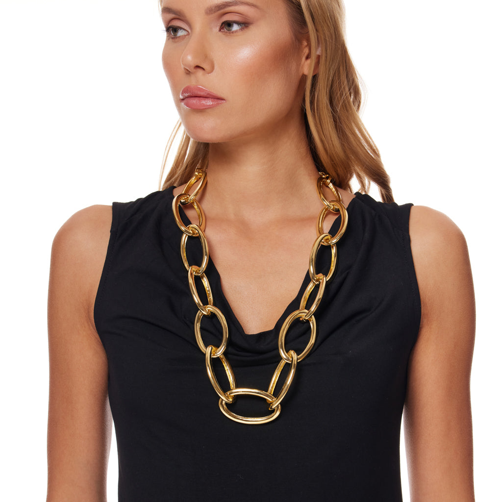 Be bold with this adjustable polished gold oval link hook clasp necklace.