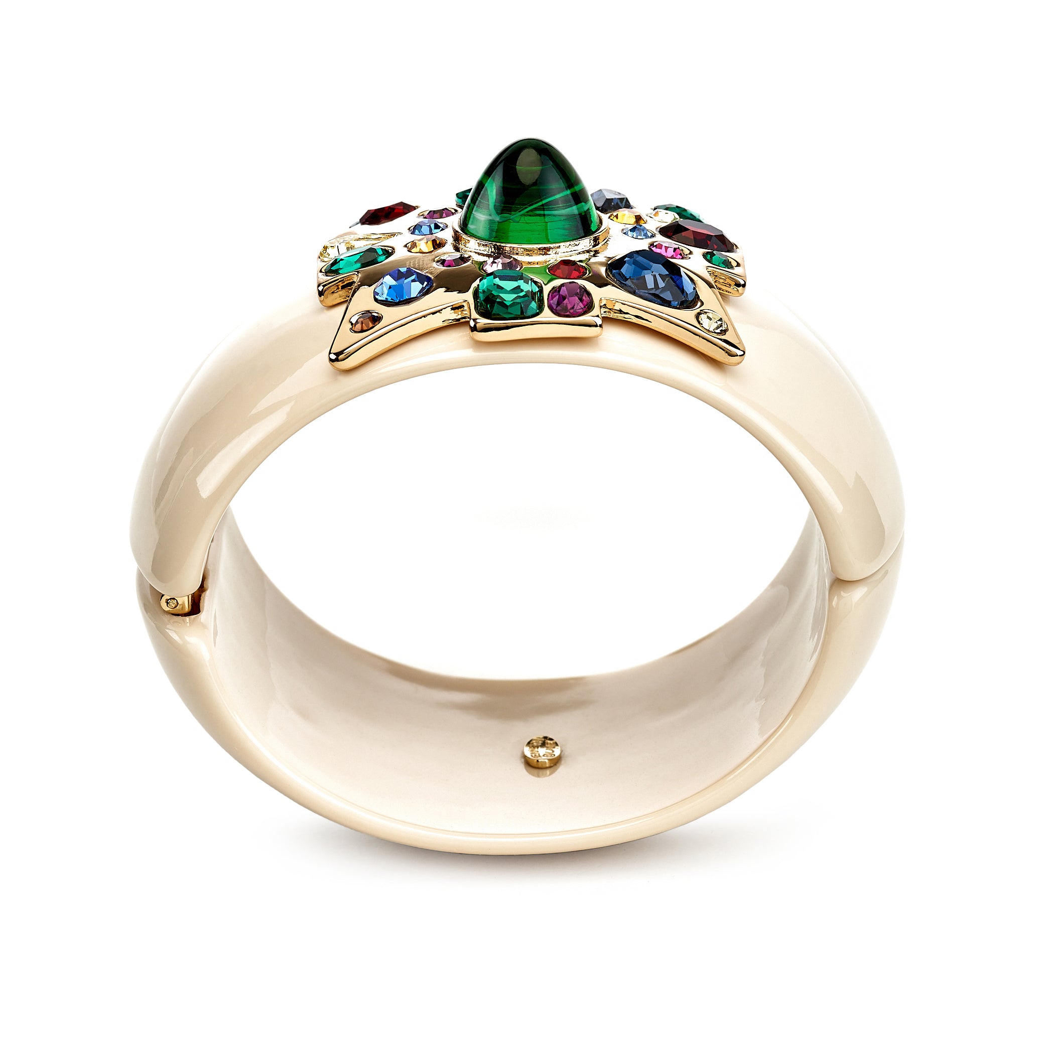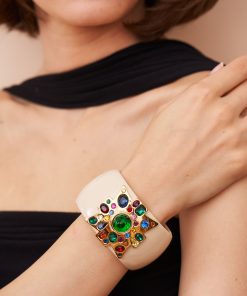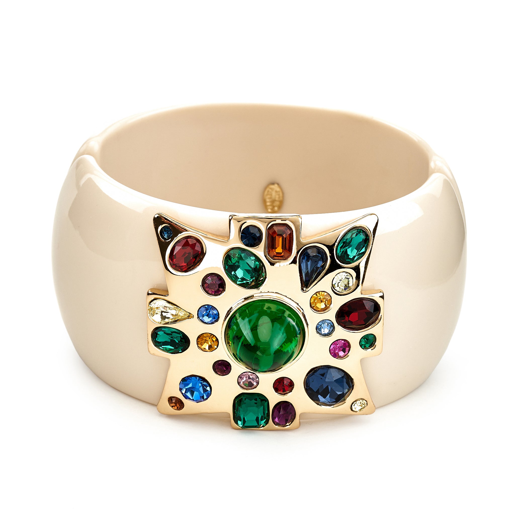 Elegant and bold, this large ivory Maltese cross bracelet features gold accents, multi-dark gems, and a stunning emerald center for a sophisticated statement.
