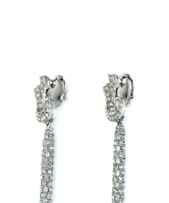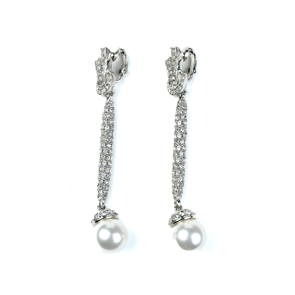 These crystal and silver clip earrings featuring a pearl bottom boast a unique design that combines classic elegance with modern flair. Wear these for a fashionable yet timeless touch to any style.