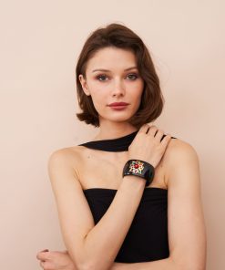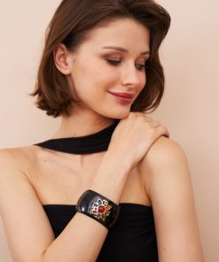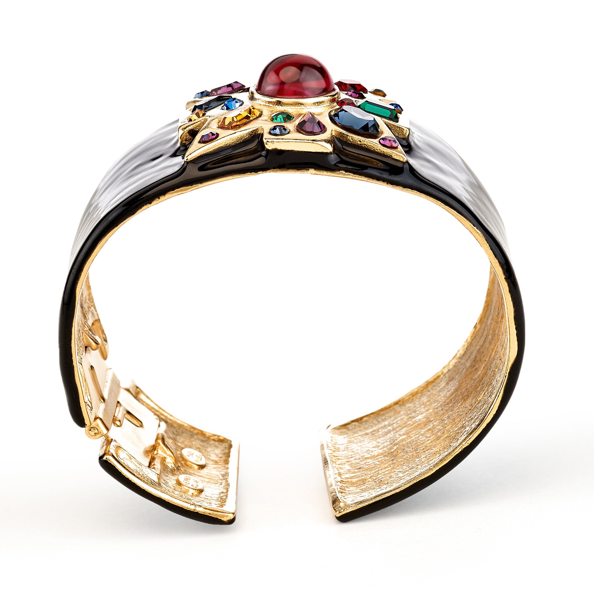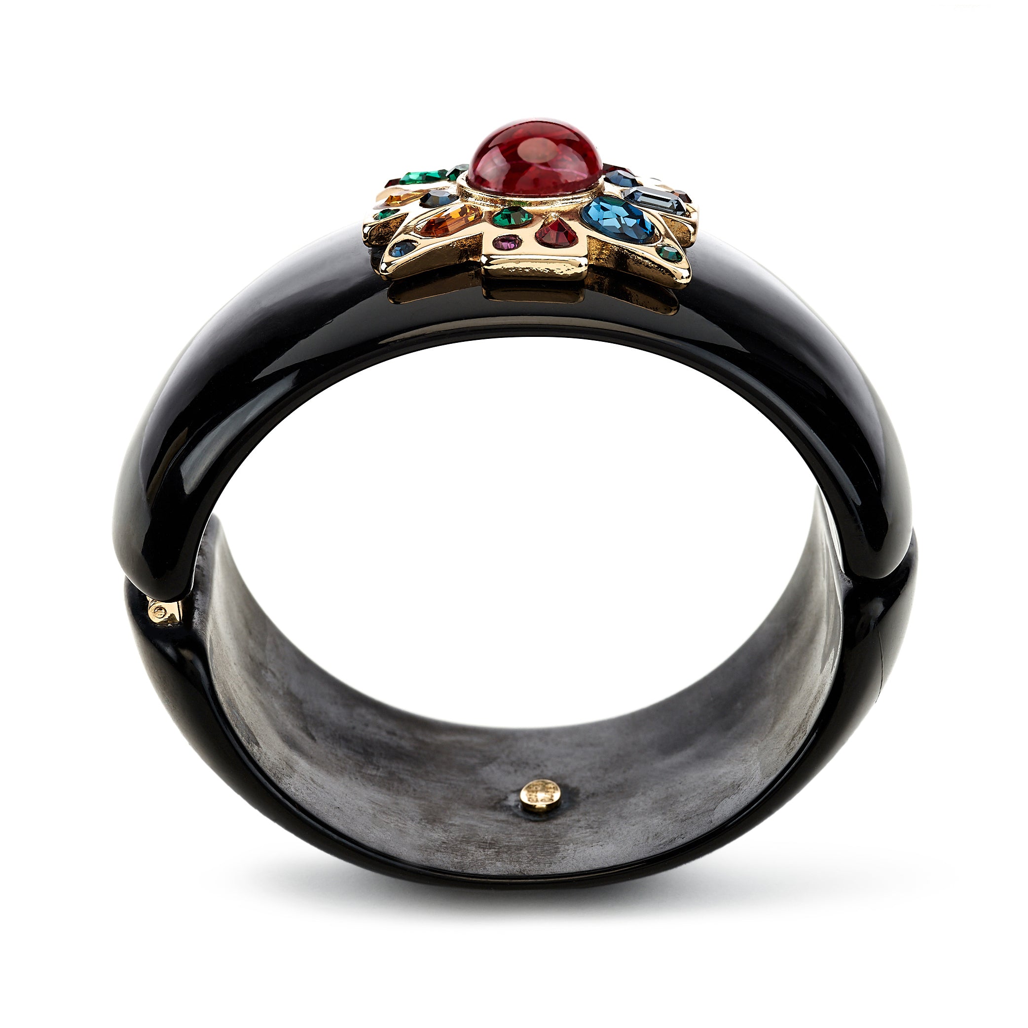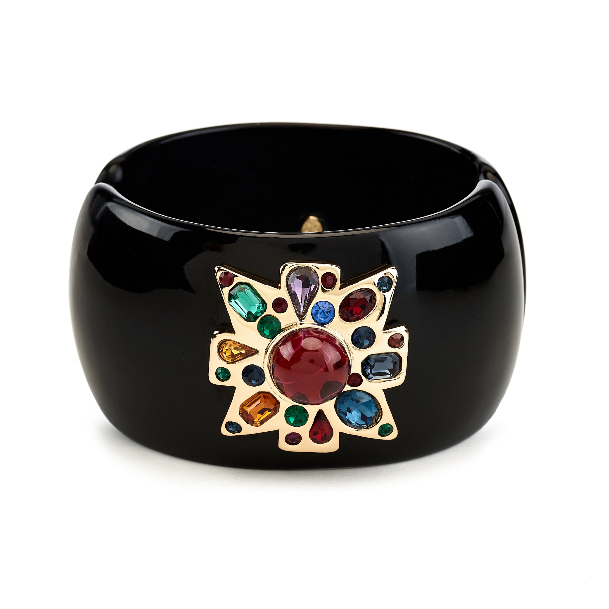 Bold and striking, this 1.25″ wide black Maltese cross hinged cuff features multi dark gems with a vibrant ruby center for a dramatic, eye-catching look.