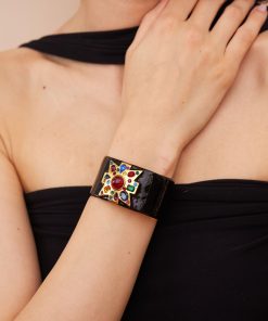 Bold and striking, this black Maltese cross bracelet features small gold accents, multi-dark gems, and a vibrant ruby center for a dramatic, eye-catching design.