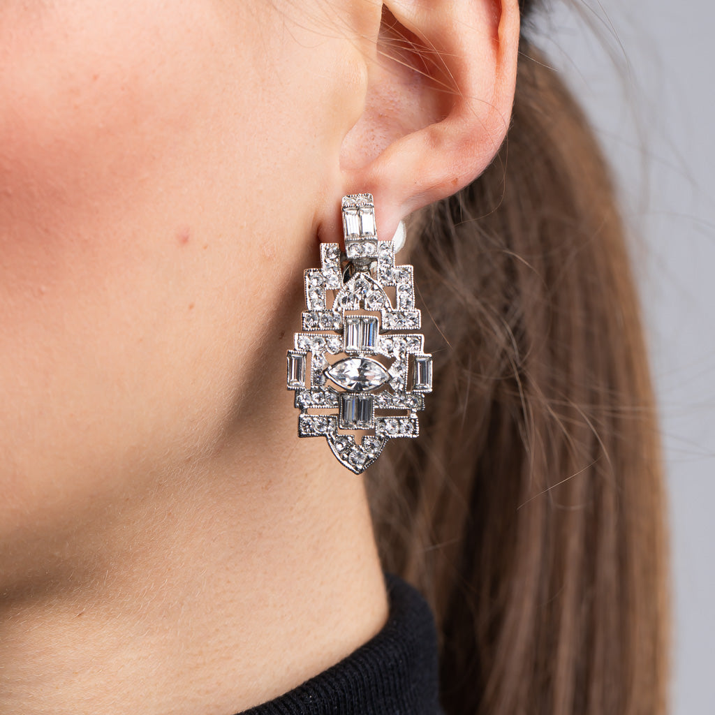 Mirroring the glamorous geometry of the Art Deco era, these silver and crystal-set clip earrings adds vintage-chic sparkle to your look. Pair with our Silver and Crystal Art Deco Link Bracelet.